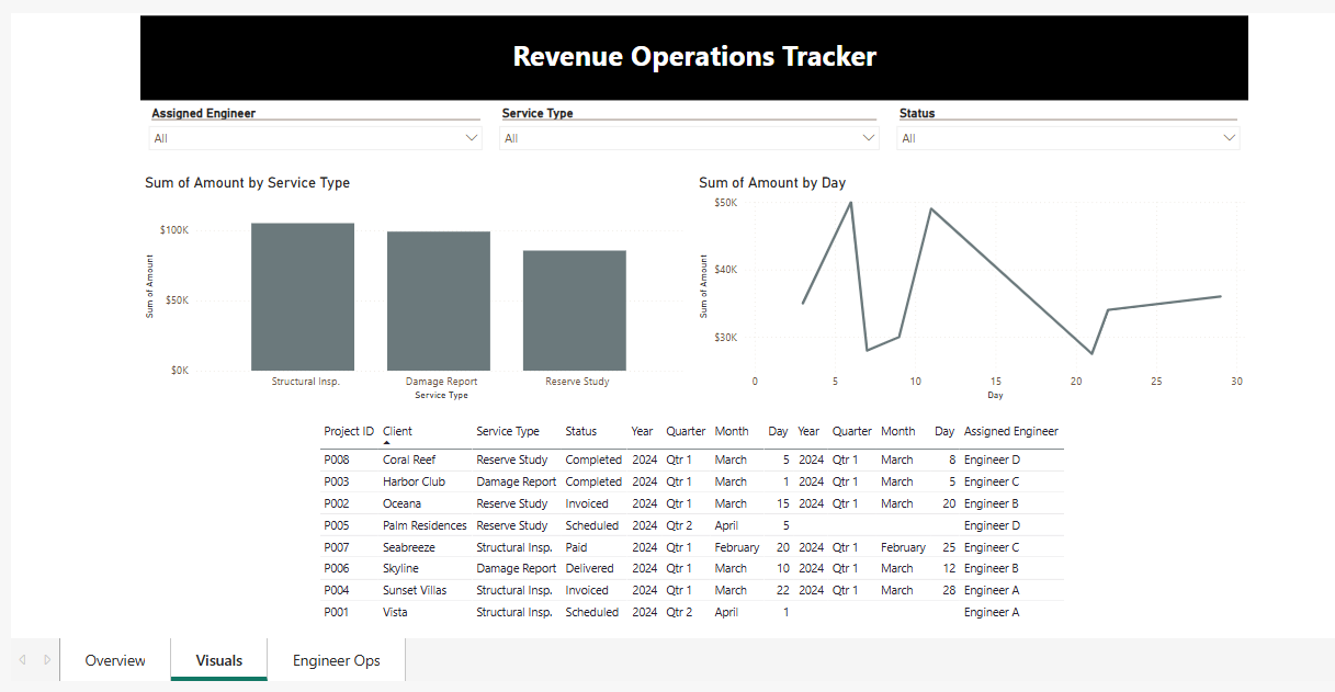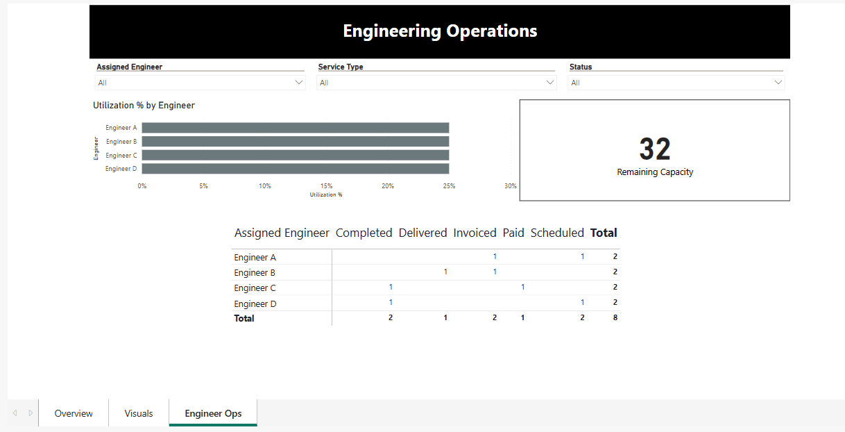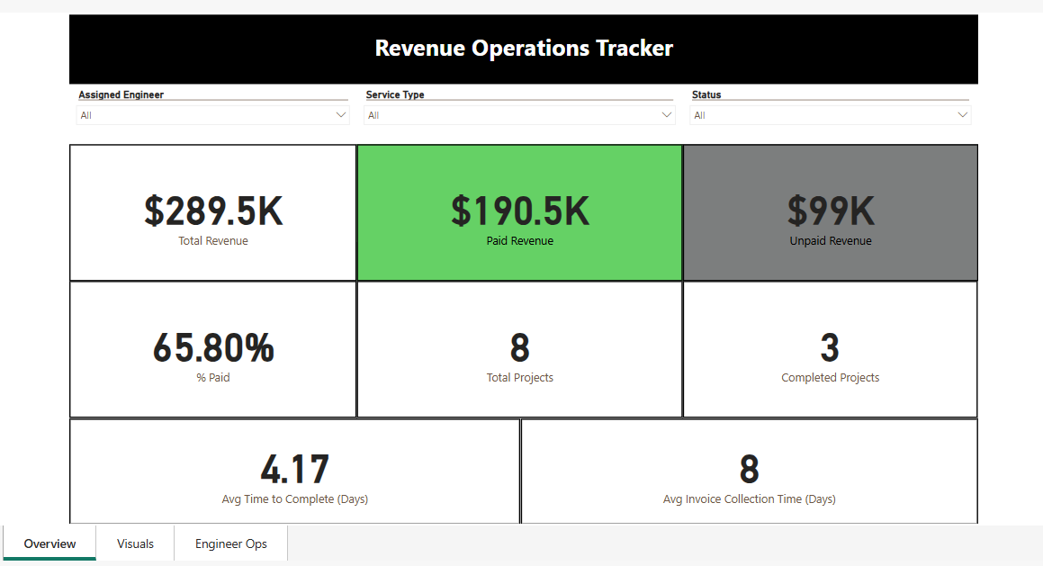 This dashboard provides a real-time simulation of project flow, engineer utilization, and revenue health across the operations pipeline. It highlights where jobs are slowing down, how quickly invoices are being collected, and how efficiently field resources are being used. Designed to support operational visibility, it enables better forecasting, faster decision-making, and smarter scaling.